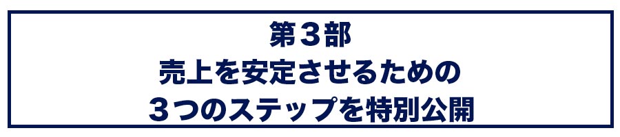 最後の第3部では、私が実際にクライアントさんにお伝えしている起業して売上を安定させるためのステップを順番にお話ししていきます。